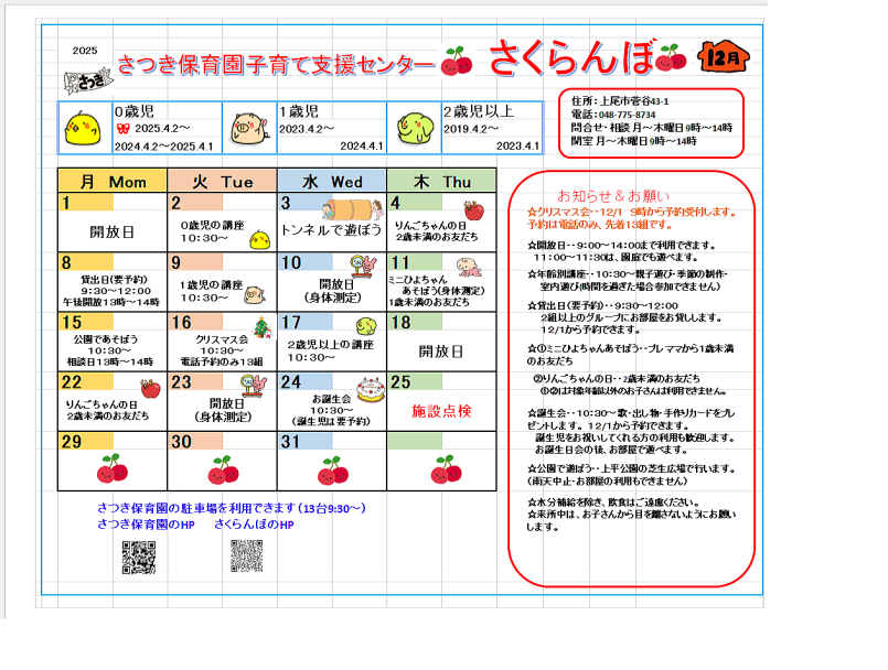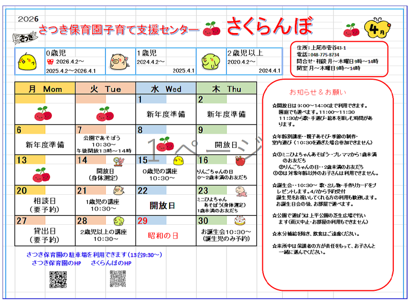 | 《場所》 ☆さつき保育園1階「さくらんぼルーム」 上尾市大字菅谷43−1 |
