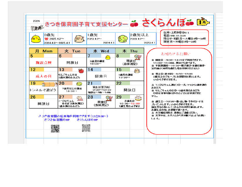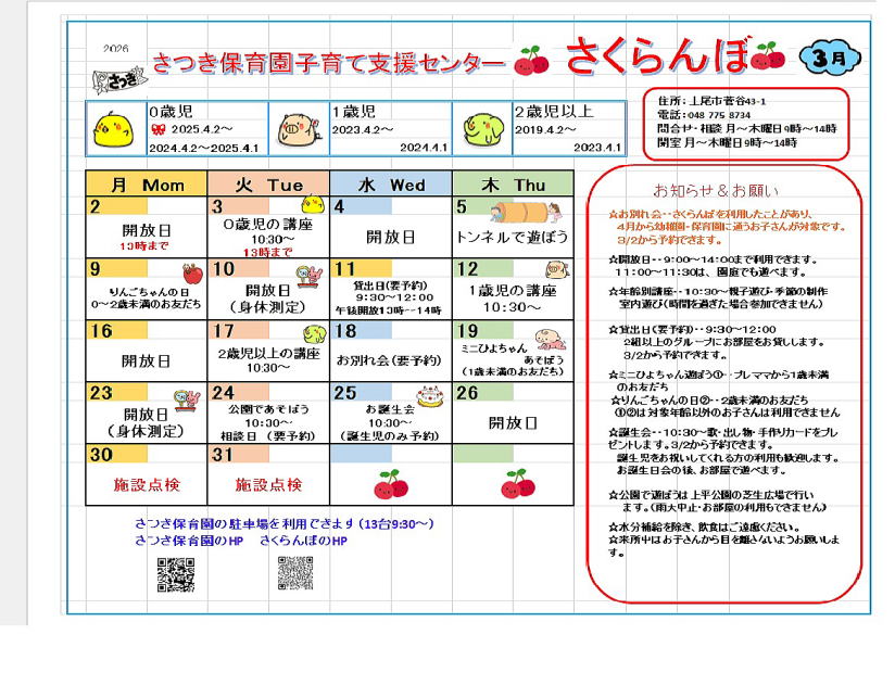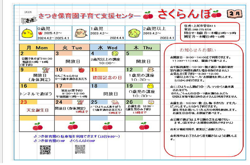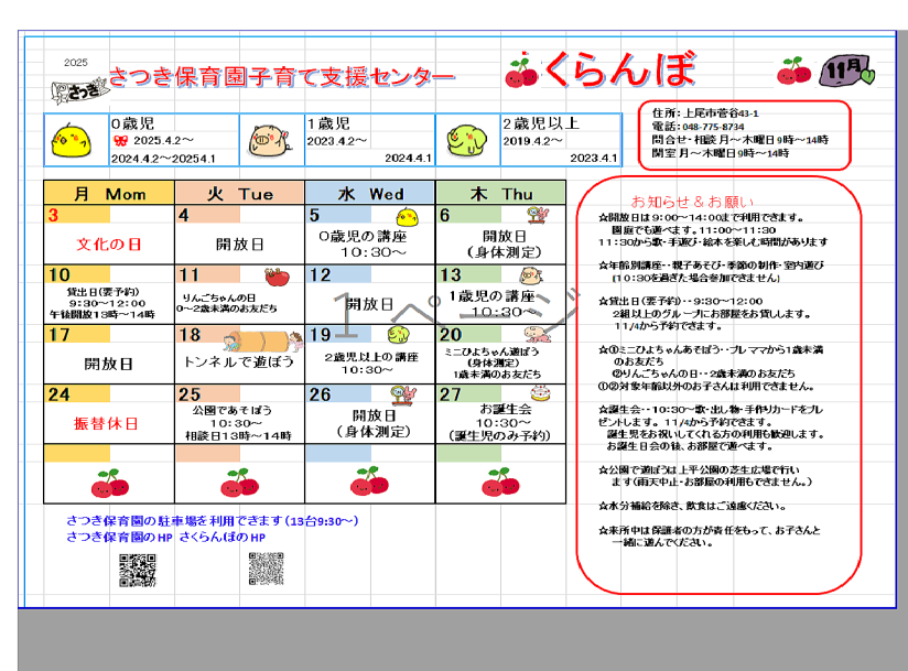 | 《場所》 ☆さつき保育園1階「さくらんぼルーム」 上尾市大字菅谷43−1 |